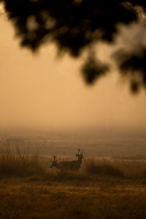 Two deers with antlers basking in the evening sun
